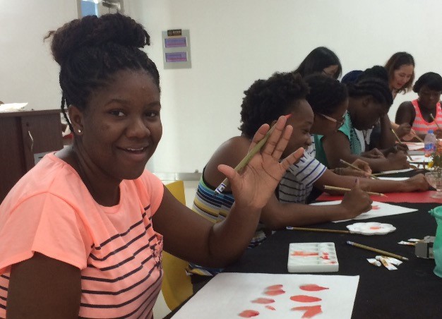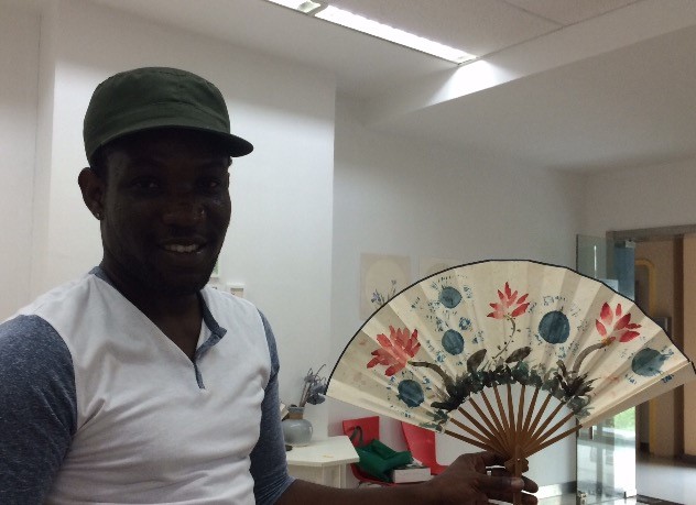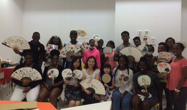 7月4日艺术培训中心主任蔡亚波老师为西印度大学孔子学院的留学生们主讲中国画画扇课程。外国学生好奇的体验毛笔在宣纸上水墨交融的奇妙变化,通过画扇感受墨分五色的层次感受到了中国艺术的博大精深。